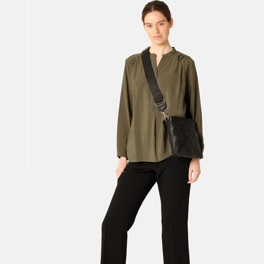 This faux leather bag in black by Ilse Jacobsen is spacious enough for all your essentials and has a wide adjustable logo strap and a zippered closure.